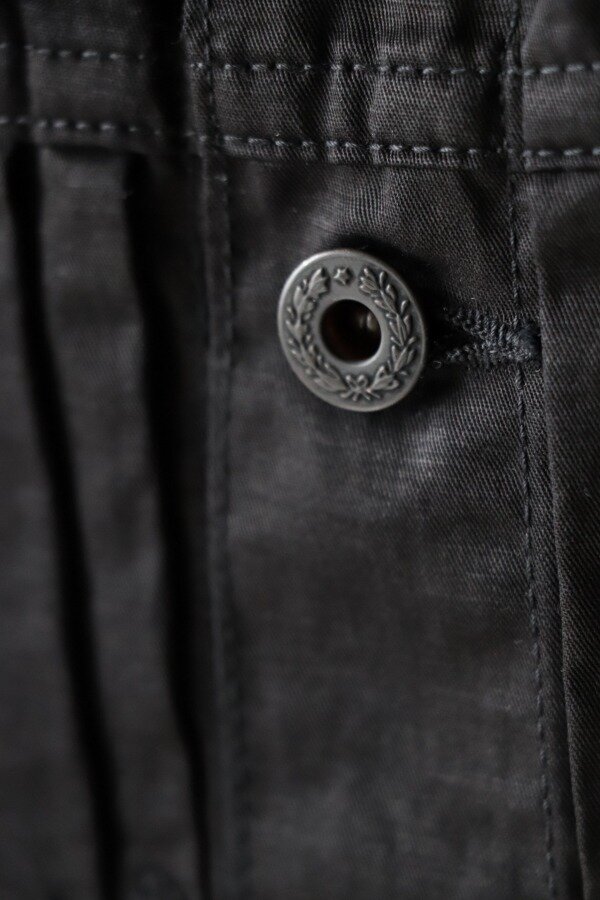 ボタンは、アンティーク・ブラックのワンスター・ドーナツボタンを使用。最上部のボタンのみメタル・ボタンをハンド・ソーイングにて取り付けています。