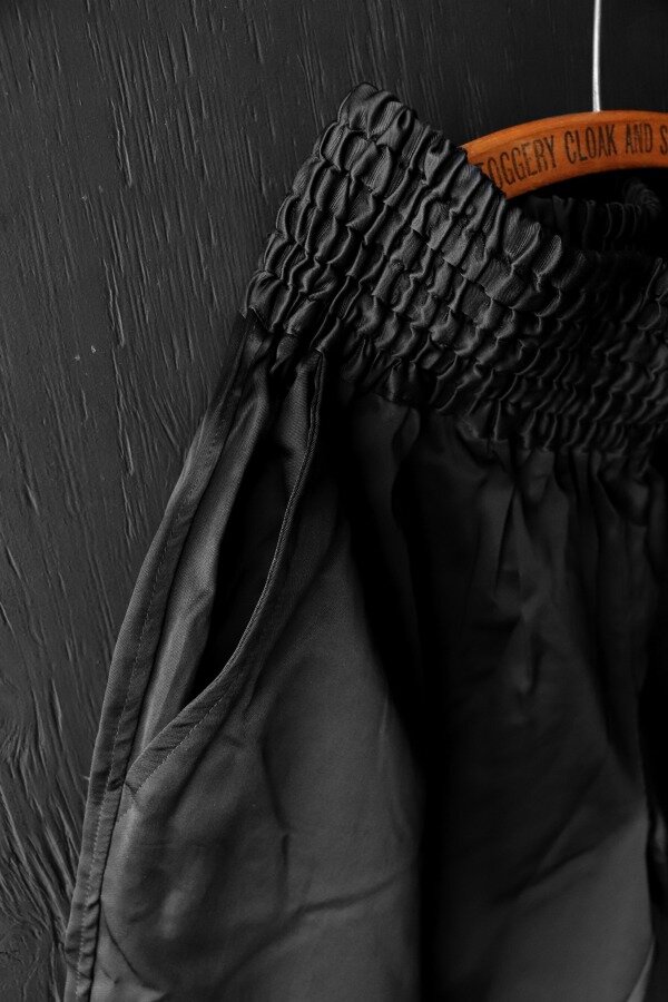 サイドとバック片側にはポケットをつけ、普段使いの利便性も考慮。ドレープ感のある滑りの良い生地とウエストゴム仕様によりとてもイージーで軽快な履き心地をお楽しみいただけます。