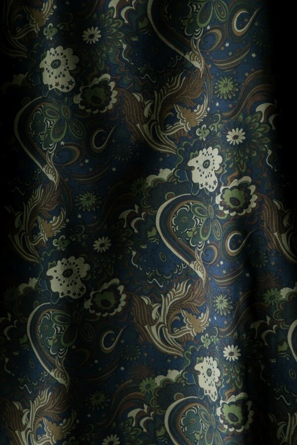 生地の特徴 / 目を惹くアーティスティックな柄が最大の特徴でもある総柄生地。非常に滑らかなレーヨンキュプラシルク素材となっており、独特のドレープ感と風合いは美しい佇まいを演出します。滑るような肌触りと、繊細かつ大胆に表現された柄を春夏スタイルにてお楽しみください。