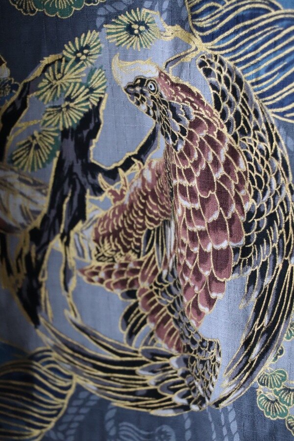 生地の特徴 / コットン100%のドビー織生地。金ラインが目を惹く図柄は、初夢に見ると運が上がると言われる一富士二鷹に吉祥柄の松竹梅をあしらった縁起の良い柄となっております。縦横に織り模様が入ったベース生地の表情や、適度なハリと乾きのあるドライな肌触りも魅力です。柄、生地感ともに春夏アイテムに最適な生地となっております。