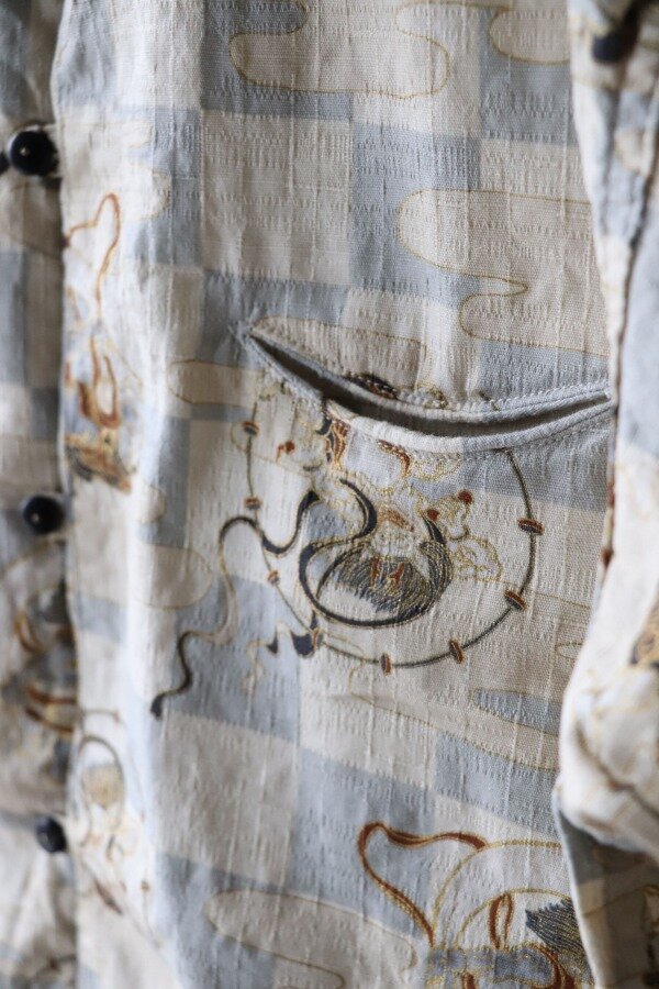 生地の特徴 / 風神雷神と市松柄がユニークなコットン100%のドビー織生地。風神雷神は本来、金屏風に描かれていますが、市松柄を背景にすることによりモダンでクールなイメージに仕上げられています。縦横に織り模様が入ったベース生地の表情や、適度なハリと乾きのあるドライな肌触りも魅力です。柄、生地感ともに春夏アイテムに最適な生地となっております。