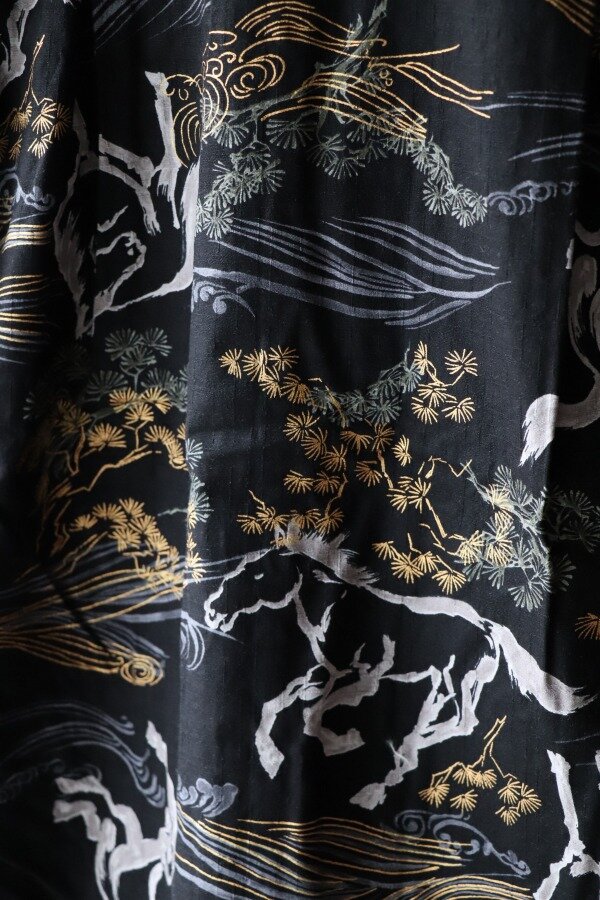 生地の特徴 / 風情あるタッチと金ラインで彩られた柄が印象的なコットン100%のドビー織生地。馬は出世運、勝負運、商売繁盛など縁起が良いとされ、馬が駆ける図柄は幸運を招くとされています。縦横に織り模様が入ったベース生地の表情や、適度なハリと乾きのあるドライな肌触りも魅力です。柄、生地感ともに春夏アイテムに最適な生地となっております。