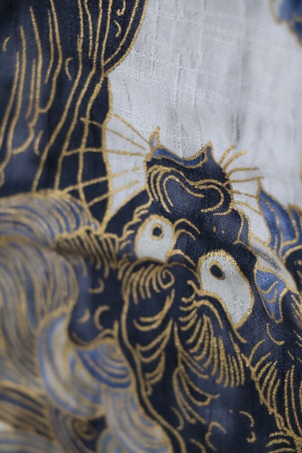 生地の特徴 / コットン100%のドビー織生地。唐獅子牡丹の躍動感を金ラインで強調したインパクトのある図柄が、春夏のスタイリングを華やかかつ粋に演出します。縦横に織り模様が入ったベース生地の表情や、適度なハリと乾きのあるドライな肌触りも魅力です。柄、生地感ともに春夏アイテムに最適な生地となっております。